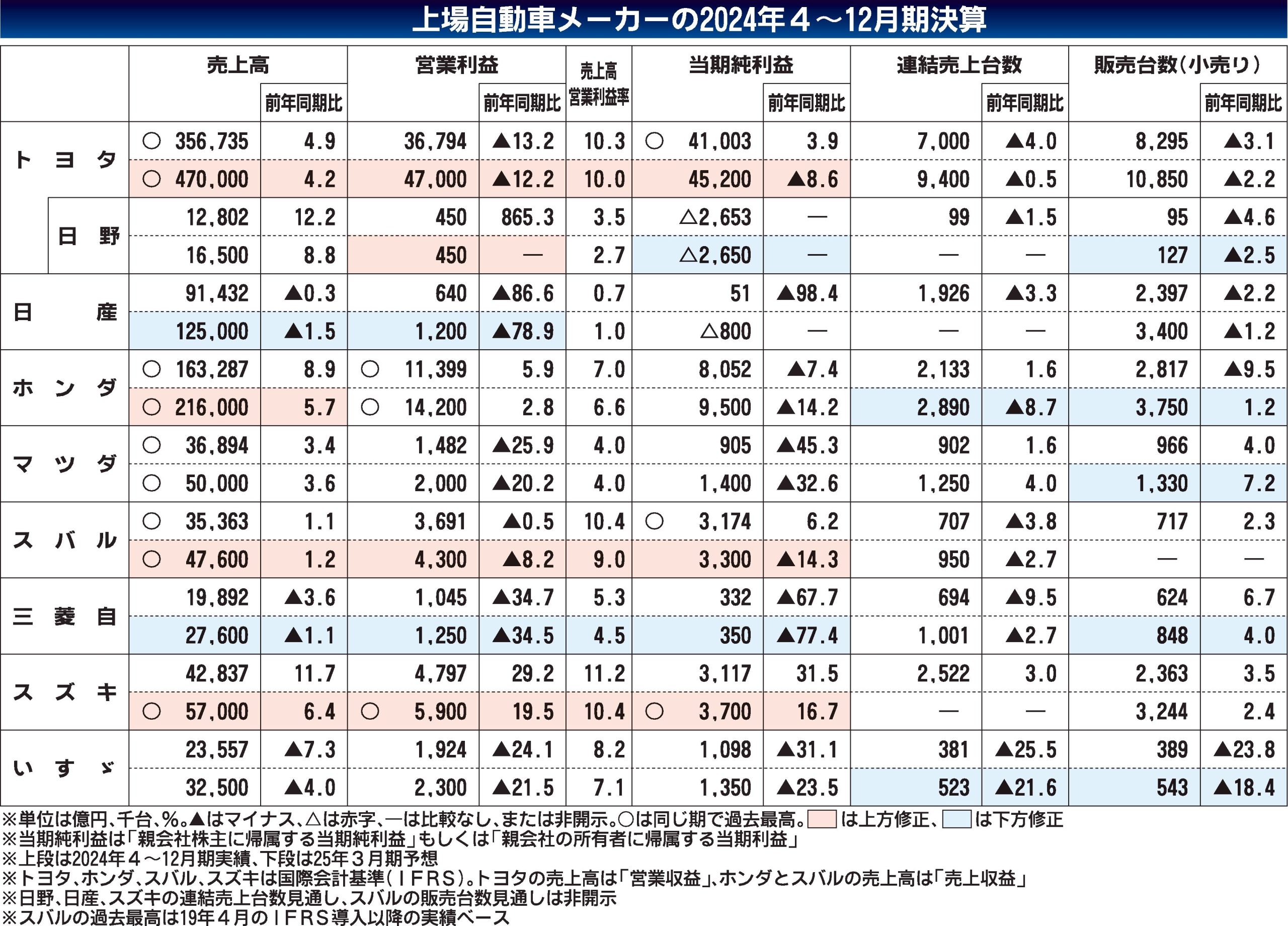 自動車メーカー9社の2024年4~12月期決算が出そろった。売上高は6社が増収となった一方、当期純損益は6社が減益もしくは赤字に終わった。米国の販売競争激化や中国・東南アジア市場の低迷が響いた。米中対立の激化やトランプ米政権が繰り出すさま...