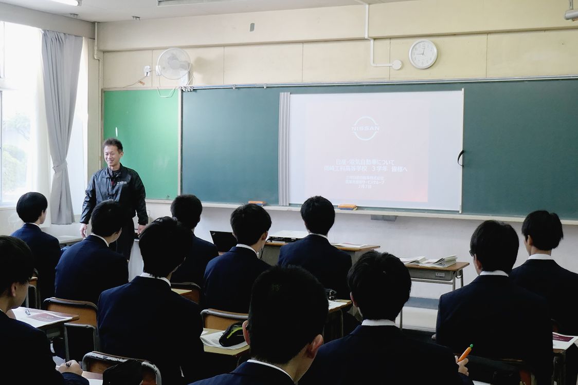 三河日産(土井彰社長)は7日、愛知県立岡崎工科高校(久永記央校長、愛知県岡崎市)で出前授業を行った。日産自動車の電気自動車(EV)の特徴や販売店での整備方法を解説した。 授業は座学と実習の2部構成で、同校機械科の3年生4人と機械科・機械デ...