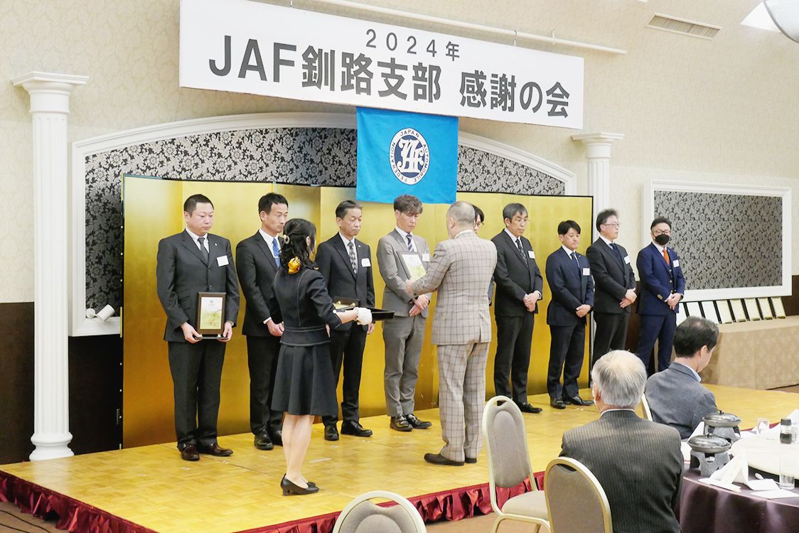 【釧路】日本自動車連盟(JAF)釧路支部(坂根篤支部長)は13日、「感謝の会」を釧路市内のホテルで開催。JAF入会獲得などで優秀な成績を収めた個人と法人を表彰した。新規入会部門の個人賞1位は釧路スバルの大野正行さんが獲得した。 坂根支部長...