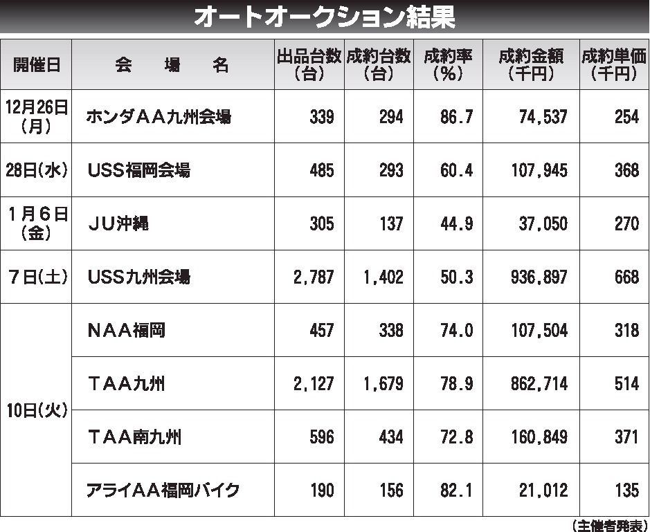 〈オートオークション結果〉九州地区 2022/12/26~2023/1/10