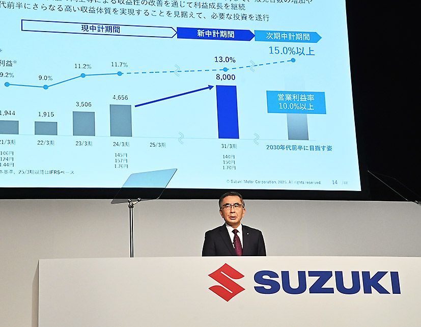 スズキは2月20日、2030年度までの6カ年中期経営計画を発表した。設備投資と研究開発費に4兆円を投じ、グローバルの環境規制対応やインドの生産能力増強を図る。売上高を8兆円(24年3月期は5兆3743億円)、営業利益を8000億円(同4656億円)に引き上げる目標だ。
