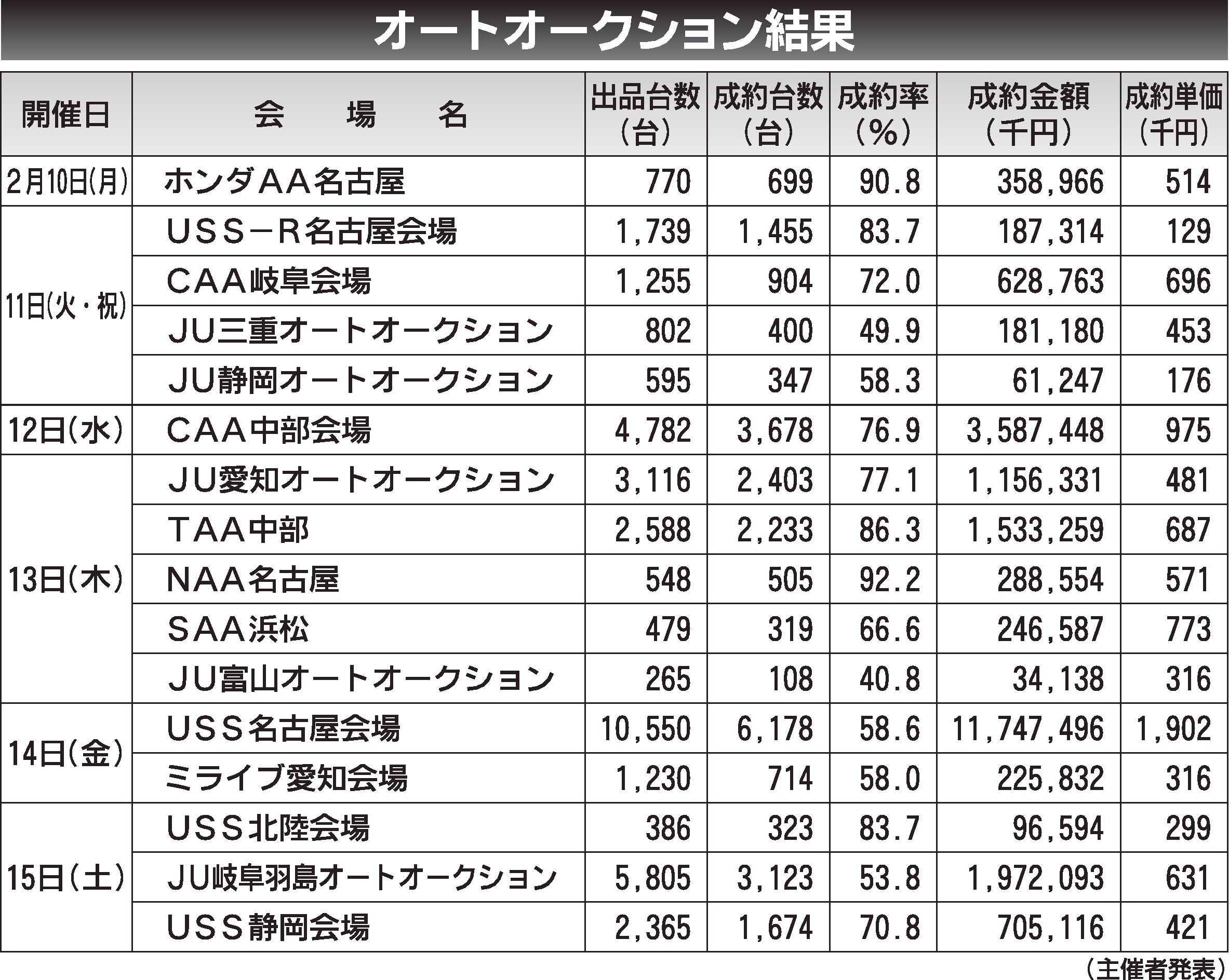 〈オートオークション結果〉中部地区 2025/2/10~15