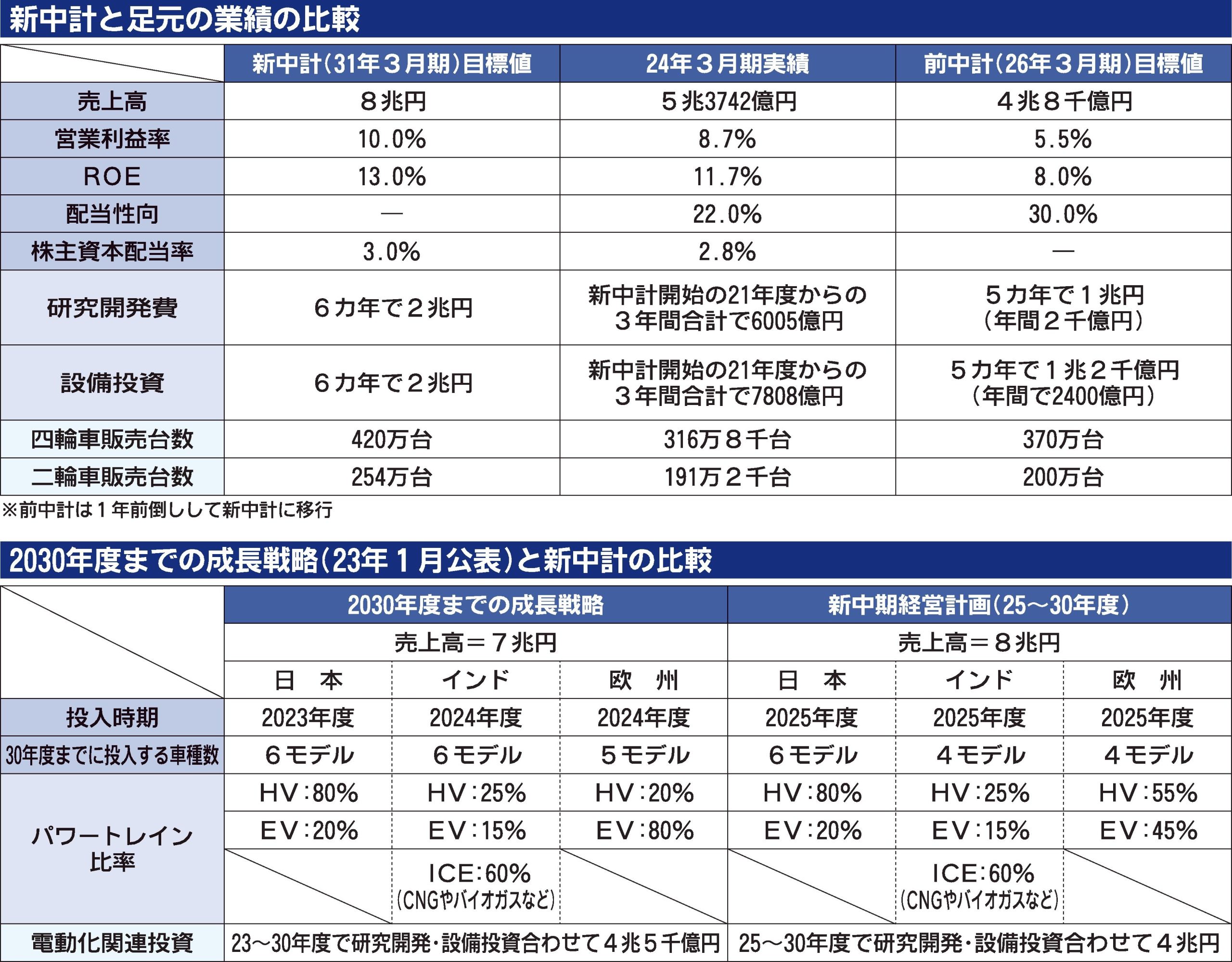 スズキは20日、新たな中期経営計画を策定し、最終2030年度に売上高8兆円を目指すと発表した。営業利益は8千億円、営業利益率は10%に設定した。主力市場のインドでは乗用車シェア5割を目指すほか、年間400万台の生産体制を構築し、インドから...