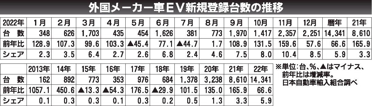 日本自動車輸入組合(JAIA、上野金太郎理事長)がまとめた2022年の外国メーカー製電気自動車(EV)の販売台数は、前年比66・6%増の1万4341台で過去最多となった。1万台の大台超えは初めて。新車生産の停滞や完成車輸送のひっ迫などによ...