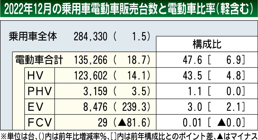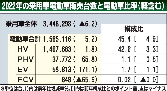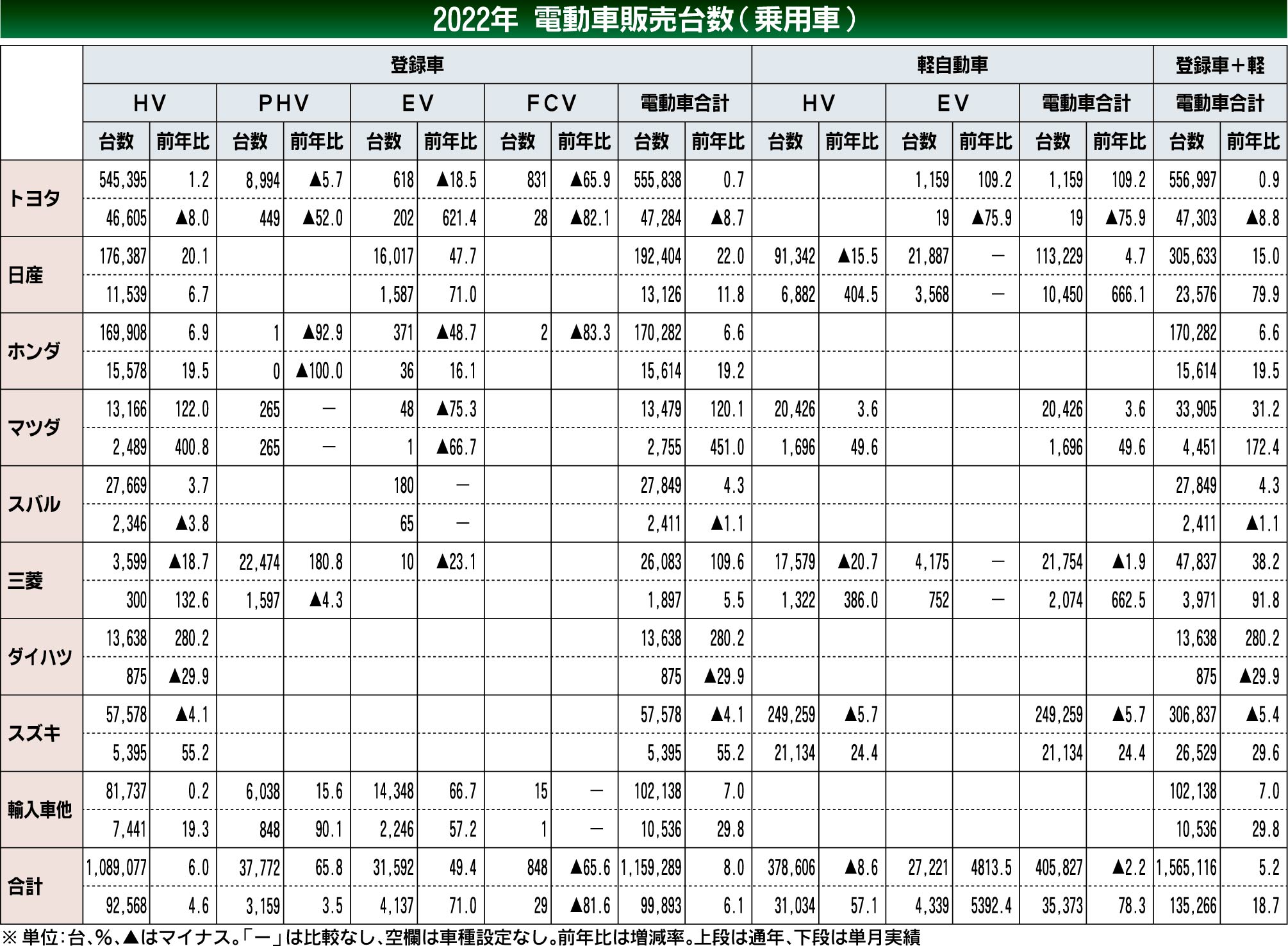 2022年の国内電動車販売台数(乗用車、登録車と軽自動車の合計)は156万5116台(前年比5・2%増)となり、2年ぶりに増加した。中でも電気自動車(EV)は5万8813台と同2・7倍に増え、EV比率は1・1㌽増の1・7%に上昇した。日産...