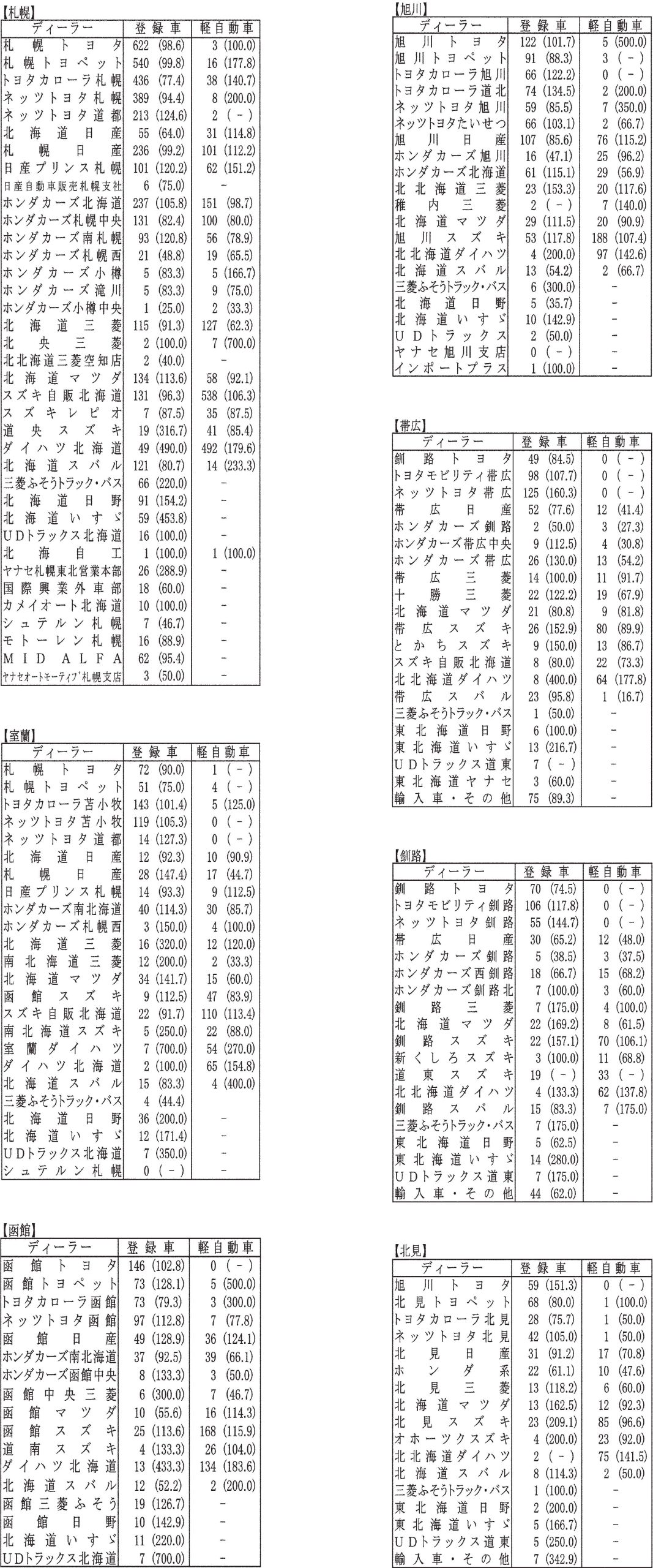 〈1月度全道管内別ディーラー別新車登録・届け出台数(カッコ内は前年同月比)〉札幌管内ホンダ系・スズキ系の登録台数は自販連正会員分