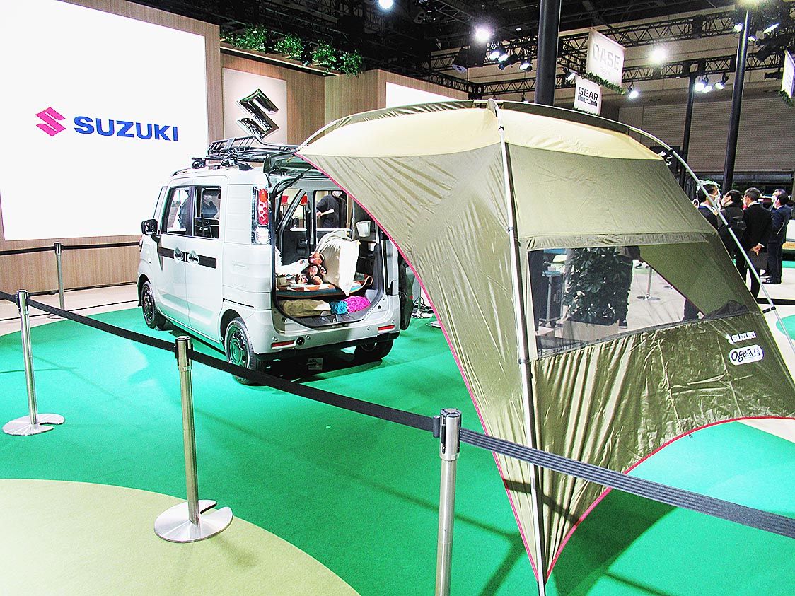 展示車のうち「スペーシア ベース」はキャンプや車中泊をイメージした1台と、カフェをイメージした1台を用意した。2台はともにスズキのイメージキャラクターの「ももいろクローバーZ」のメンバーが装飾のアイデアを考え、現車に反映した。