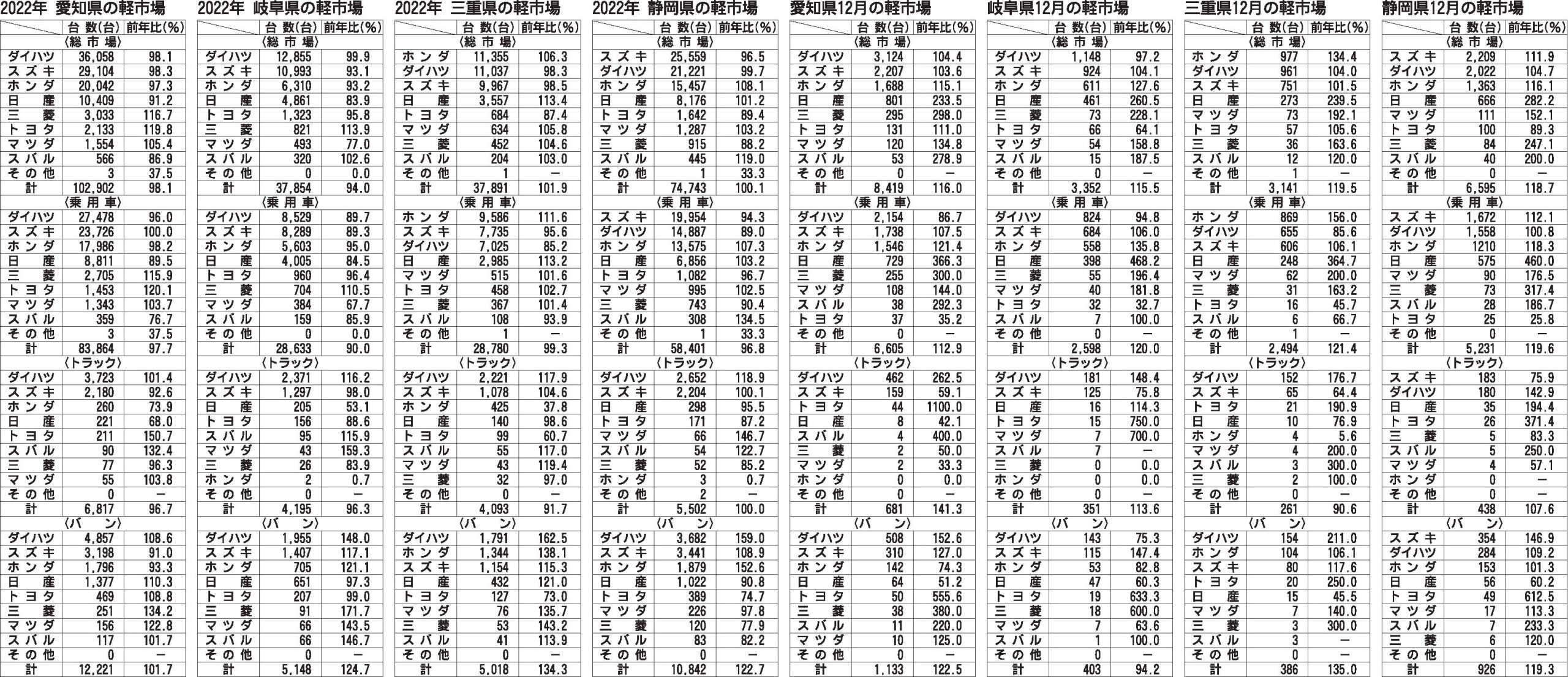 〈中部4県2022年/12月の軽市場〉愛知県/岐阜県/三重県/静岡県