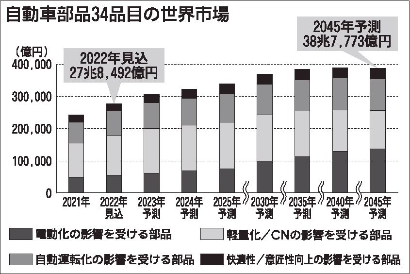 富士キメラ総研(田中一志社長、東京都中央区)は、電動化や自動運転、脱炭素化などで、影響を受ける自動車部品34品目の世界市場を調査した。カーボンニュートラル(温室効果ガス排出実質ゼロ)を目指す2050年の目前となる45年には34品目で約39...