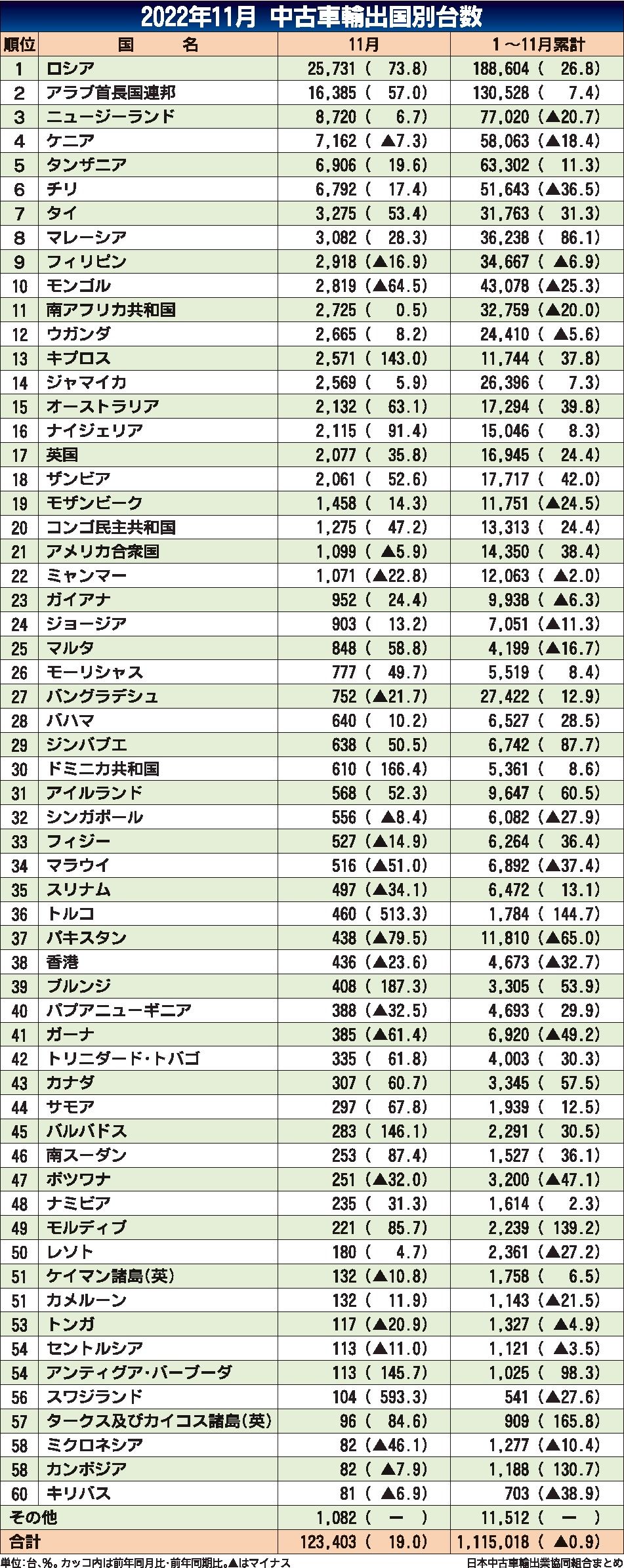 日本中古車輸出業協同組合(JUMVEA、佐藤博理事長)がまとめた2022年11月の中古車輸出台数(車両価格20万円以上)は、前年同月比19・0%増の12万3403台と2カ月連続で増加し、10万台超えも2カ月連続となった。仕向け地別では、日...