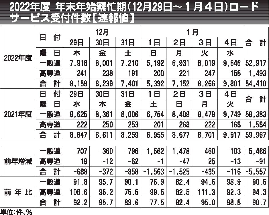 日本自動車連盟(JAF、坂口正芳会長)が発表した年末年始期間(2022年12月29日~23年1月4日)のロードサービス受付件数(速報値)は、前年同期比9.3%減の5万4410件だった。このうち、一般道は同9.4%減の5万2917件、高速道路は同5.7%減の1493件と前年より減少している。