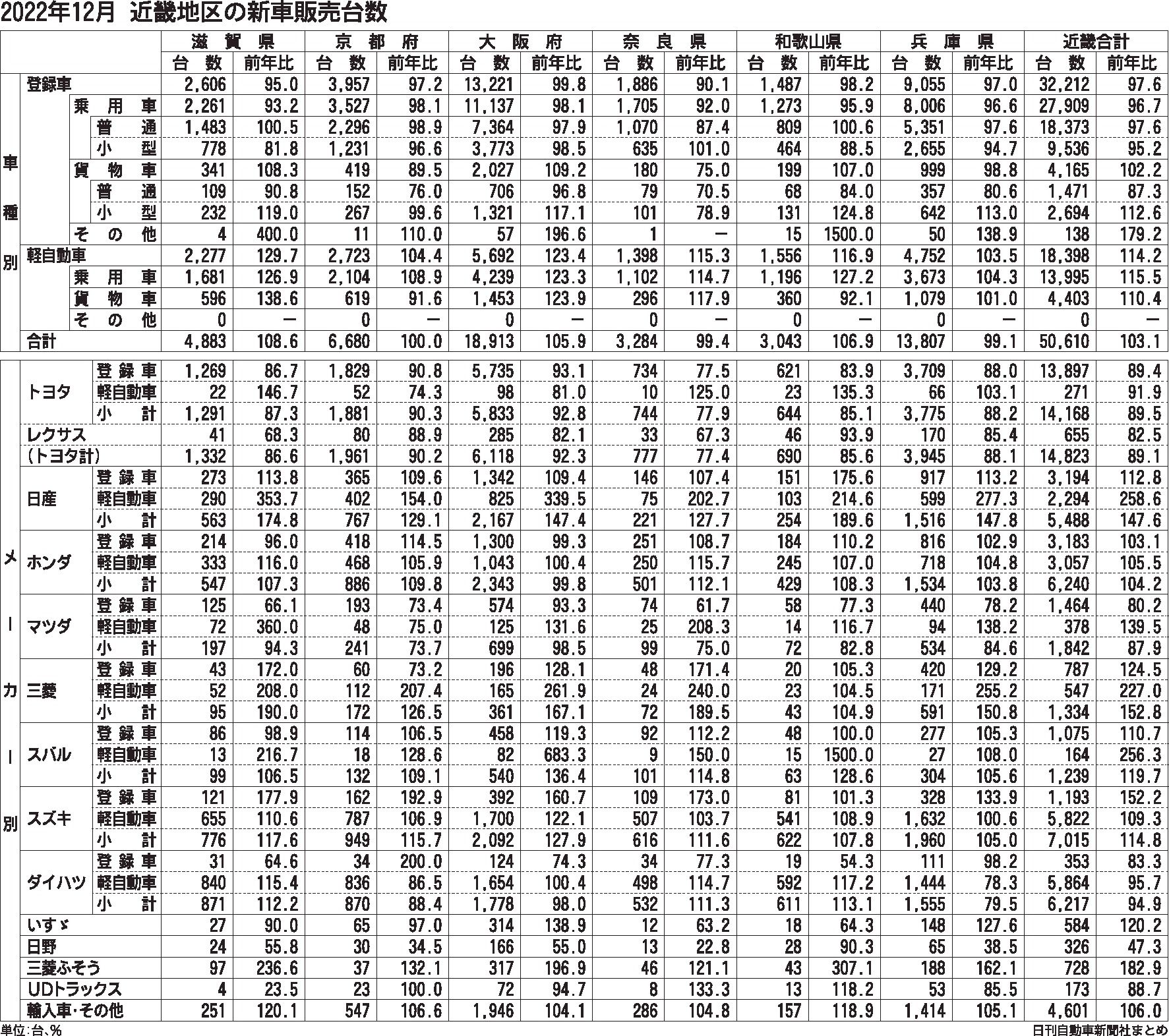 〈2022年12月 近畿地区の新車販売台数〉