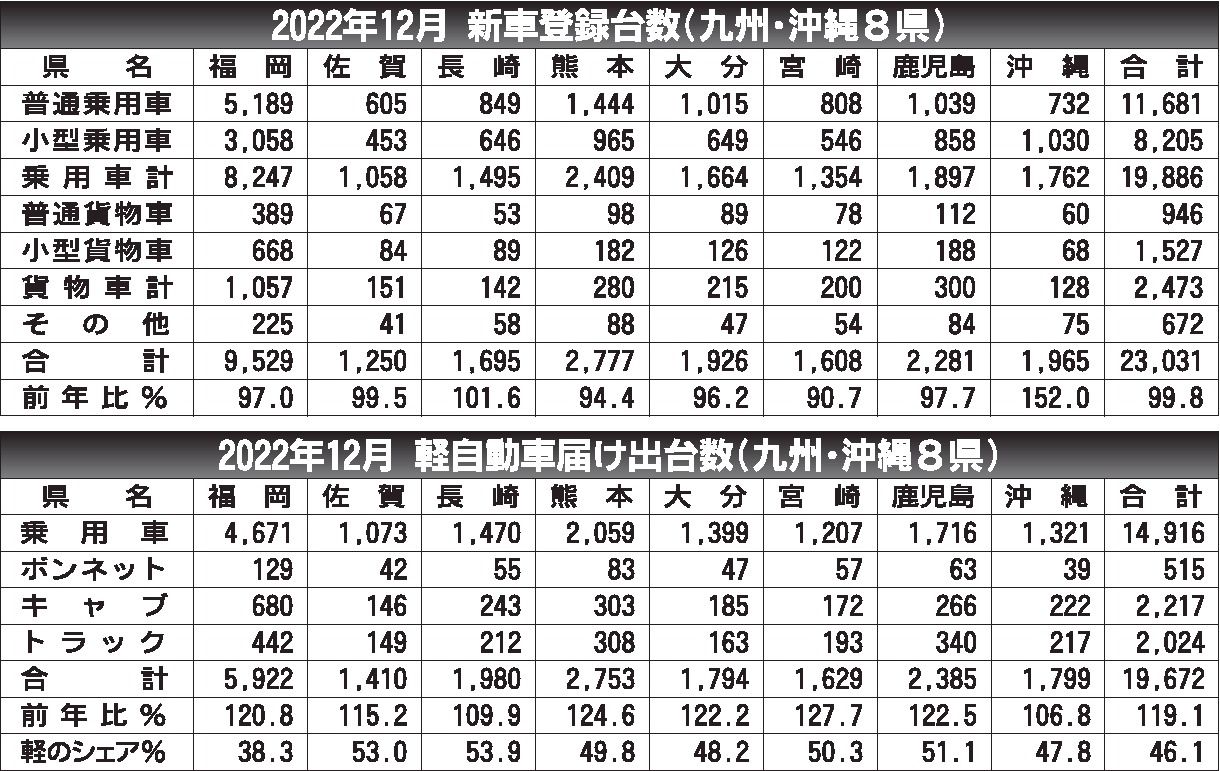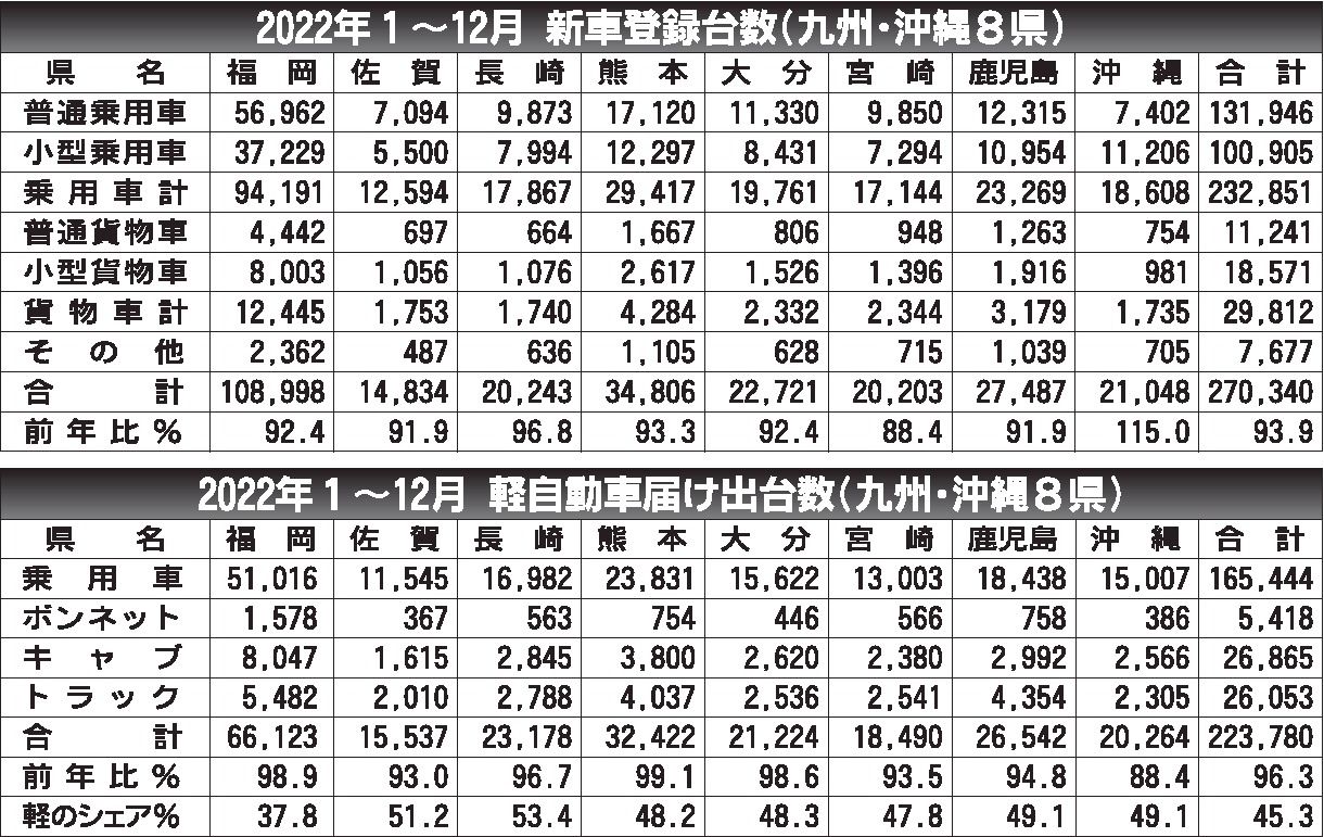 2022年(1~12月)の九州・沖縄地区の新車販売台数は、登録車、軽自動車ともに前年実績を下回り、全体では4年連続の前年割れとなる前年比5・1%減の49万4120台。11年ぶりに50万台を割り込む厳しい実績となった。 後半は挽回傾向に転じ...