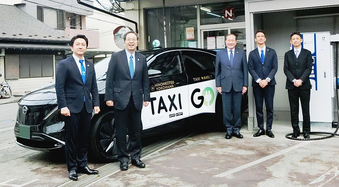 「タクシー産業GX(グリーントランスフォーメーション)プロジェクト」に取り組むモビリティテクノロジーズ(MoT、中島宏社長、東京都港区)は18日、日本交通横浜(金田隆司社長、横浜市戸塚区)の小田原営業所(神奈川県小田原市)でEVタクシーとして運行する日産自動車「アリア」を公開した。斉藤鉄夫国交相と堀内丈太郎自動車局長らも視察した。斉藤国交相は「(EVタクシーが)化石燃料に頼らない電源を使った新しいモビリティであることの大きな可能性を感じた」と語った。