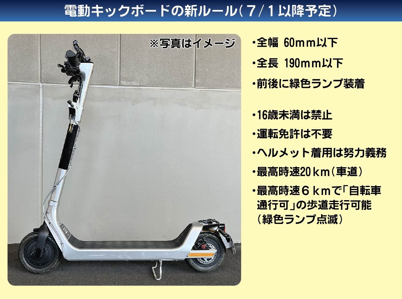 新ルールは、昨年4月に成立した改正道路交通法で決まった。適用時期について検討されていたが、電動キックボードの利用者が増えるなどしているため、想定より前倒しすることにした。