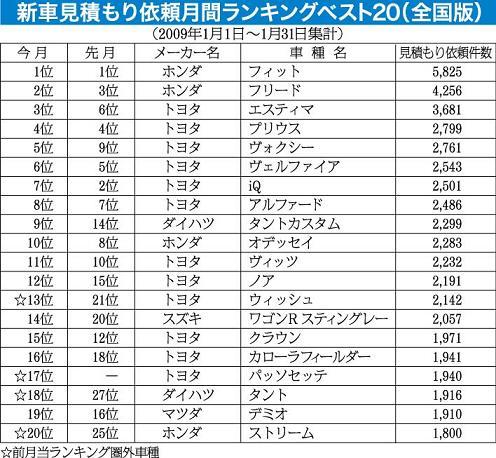 自動車専門サイトのオートックワン(加登吉邦社長、東京都港区)による1月の新車見積もりランキングは、ダイハツの「タントカスタム」が前月の14位から9位にベストテン入りしたほか、トヨタ「ウィッシュ」が21位から13位に大きくランクアップした。...