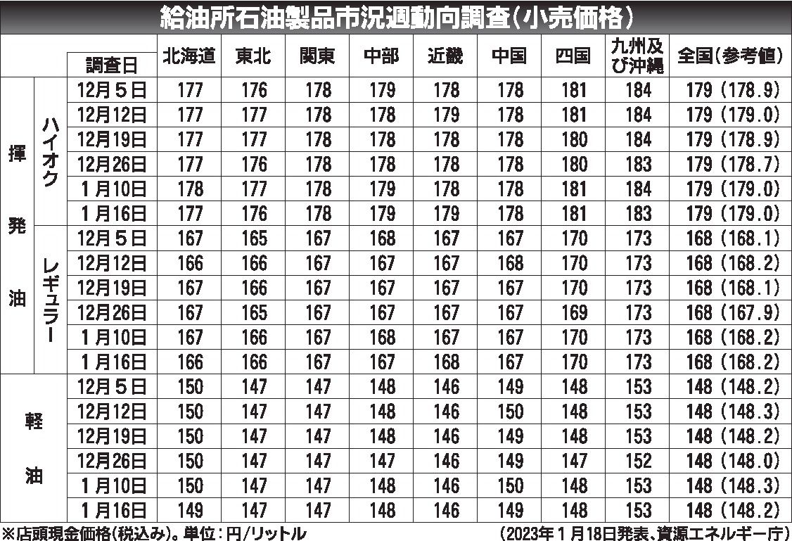 〈給油所石油製品市況週動向調査(小売価格)〉2022/12/5~2023/1/16
