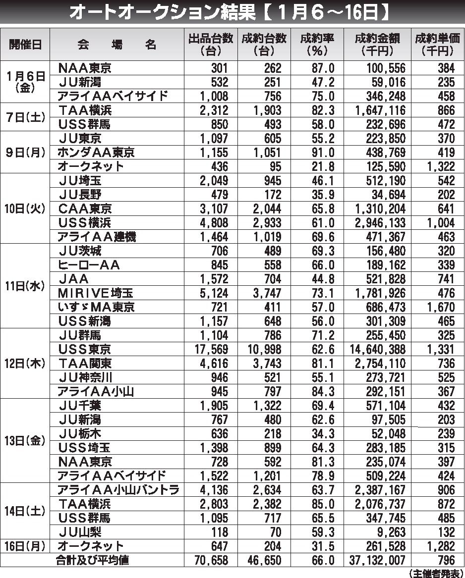 〈オートオークション結果〉首都圏 2023/1/6~16