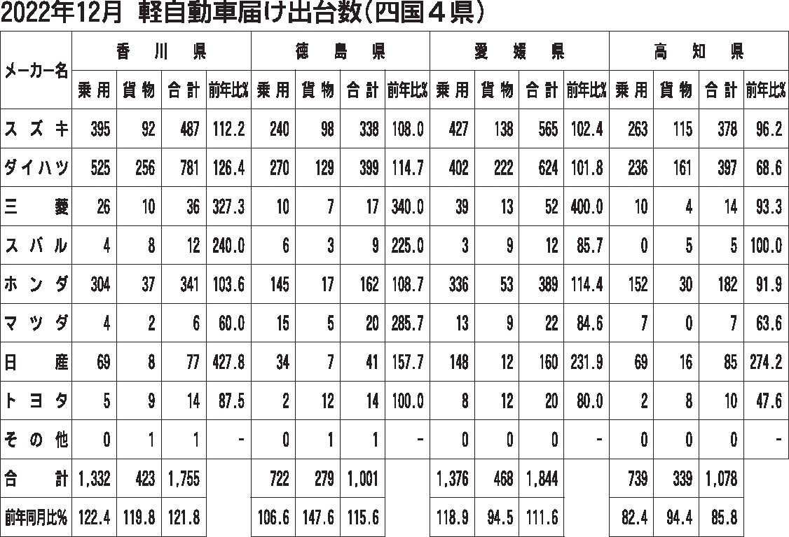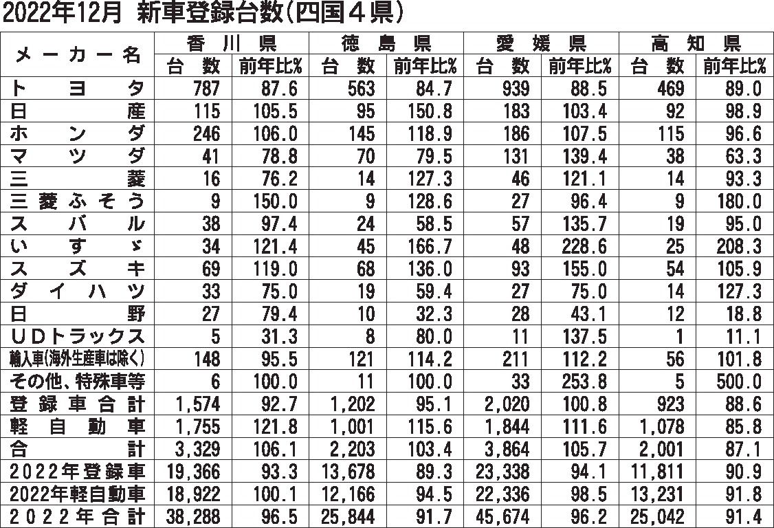 四国地区の2022年(1~12月)の新車販売台数(含軽)は、前年比5・5%減の13万4848台となり、3年連続で減少し、同データ公表を始めた過去48年間で最低の販売台数を更新した。同地区の過去最高のピークはバブル景気末期の1991年の23...