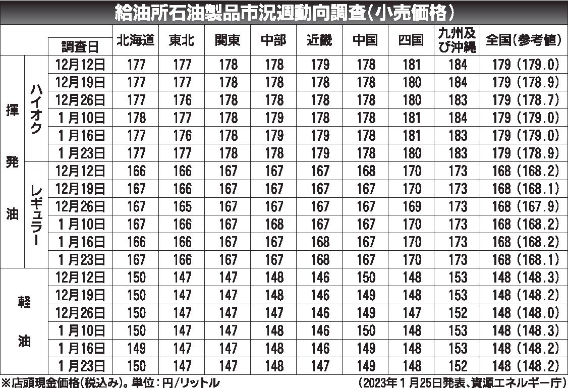 〈給油所石油製品市況週動向調査(小売価格)〉2022/12/12~2023/1/23
