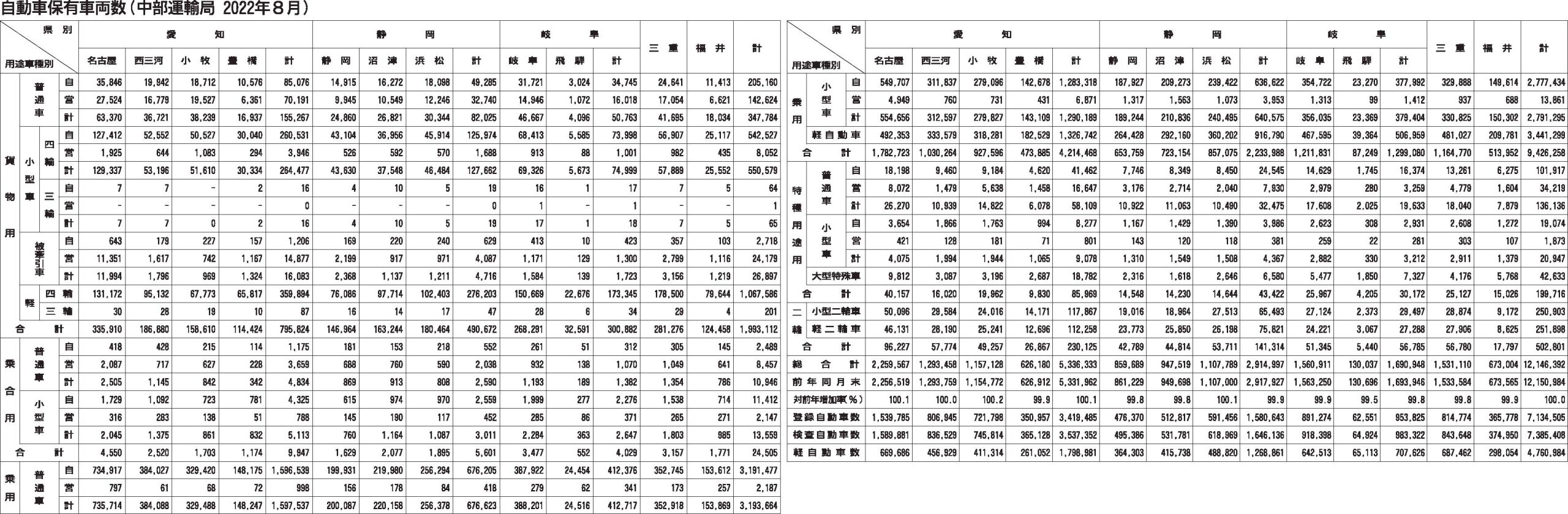 〈自動車保有車両数〉中部運輸局 2022年8月