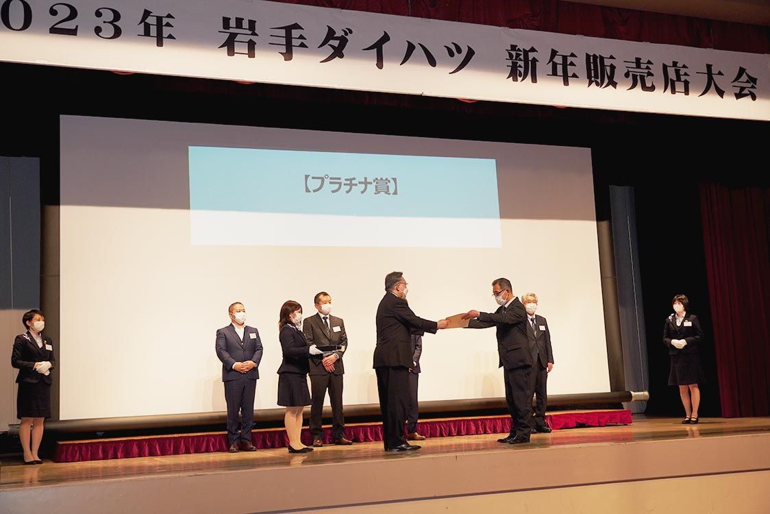 【盛岡】岩手ダイハツ(大原博之社長)は、花巻市で3年ぶりとなる「2023年新年販売店大会」を開催し、販売店経営者が参集した。同社は23年の販売店向けのサポート内容を説明するとともに、22年に優秀な実績を残した販売店を表彰した=写真。 あい...