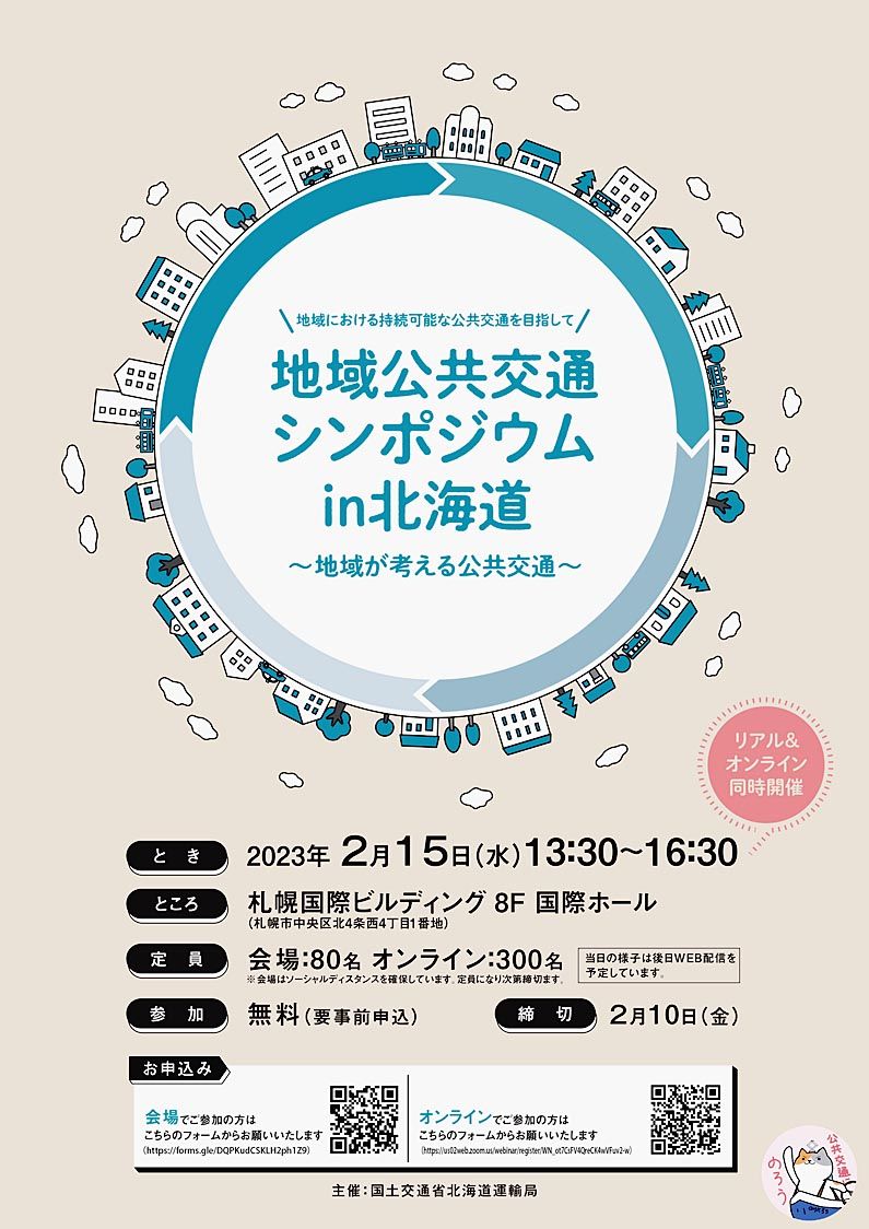 【札幌】北海道運輸局は、地域公共交通における道内外の先進的な取り組みを紹介する「地域公共交通シンポジウム イン北海道」を15日、リアルとオンラインで開催する。徳島県における取組や江差町、石狩市の事例を交通事業者などが発表。「地域が考える公...