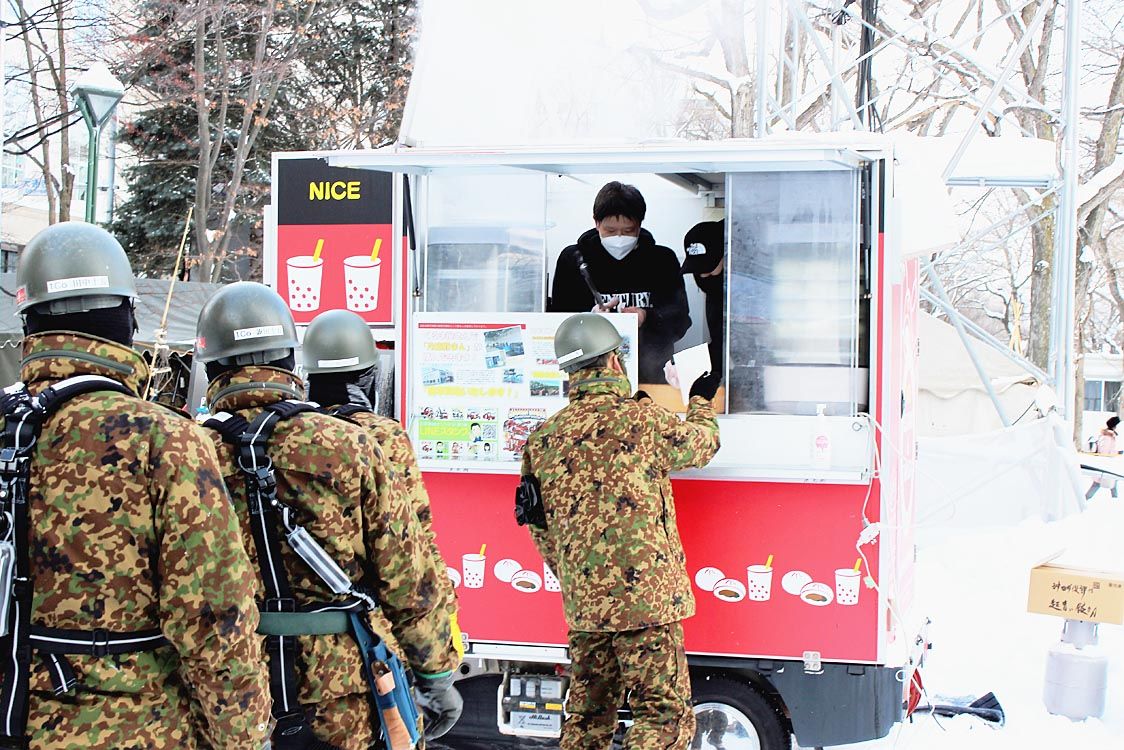 〇…熱々の豚まんを召し上がれ―。自動車リサイクルやレッカーを手掛ける協栄車輌(佐藤文彦社長)は、「さっぽろ雪まつり」の大通8丁目会場で、雪像作りに取り組む自衛隊員約120人に豚まんを差し入れ、労をねぎらった。陸上自衛隊真駒内駐屯地の「第1...