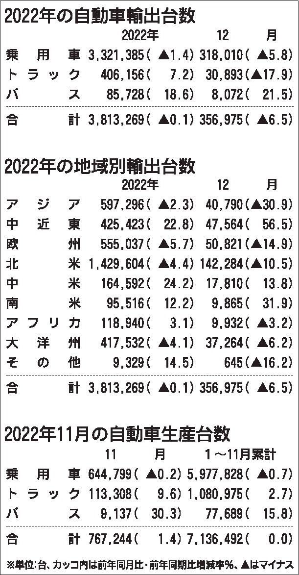 日本自動車工業会(豊田章男会長)が1月31日にまとめた2022年の自動車輸出台数は、381万3269台(前年比0.1%減)と2年ぶりにマイナスとなった。国内生産は、半導体不足による生産制約の影響が続いており、輸出台数にも影響したとみられる。中近東や中南米などの地域で増加したものの、市場規模の大きい北米や欧州、アジアなどで落ち込んだことで前年を下回った。コロナ禍前の19年の自動車輸出台数は481万台だったが回復していない。