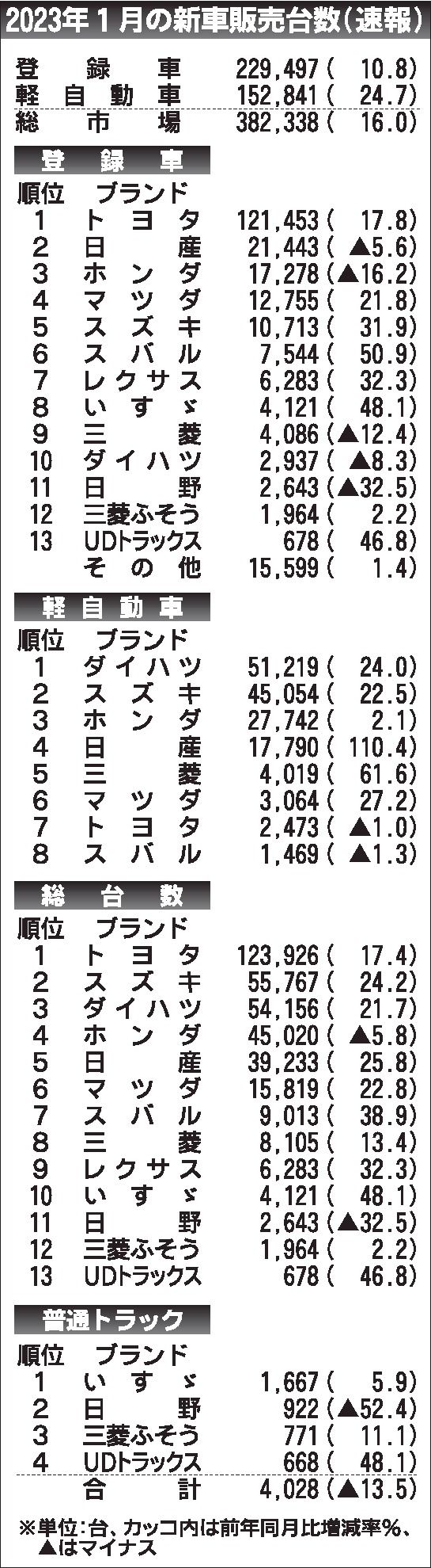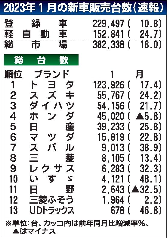 新車販売台数が、順調に増加を続けている。2023年1月の実績は前年同月比16・0%増の38万2338台と5カ月連続のプラスとなり、増加幅は前月より13・6㌽上昇した。登録車が2カ月ぶりに増加に転じたことに加え、軽自動車も前年実績を2割以上...