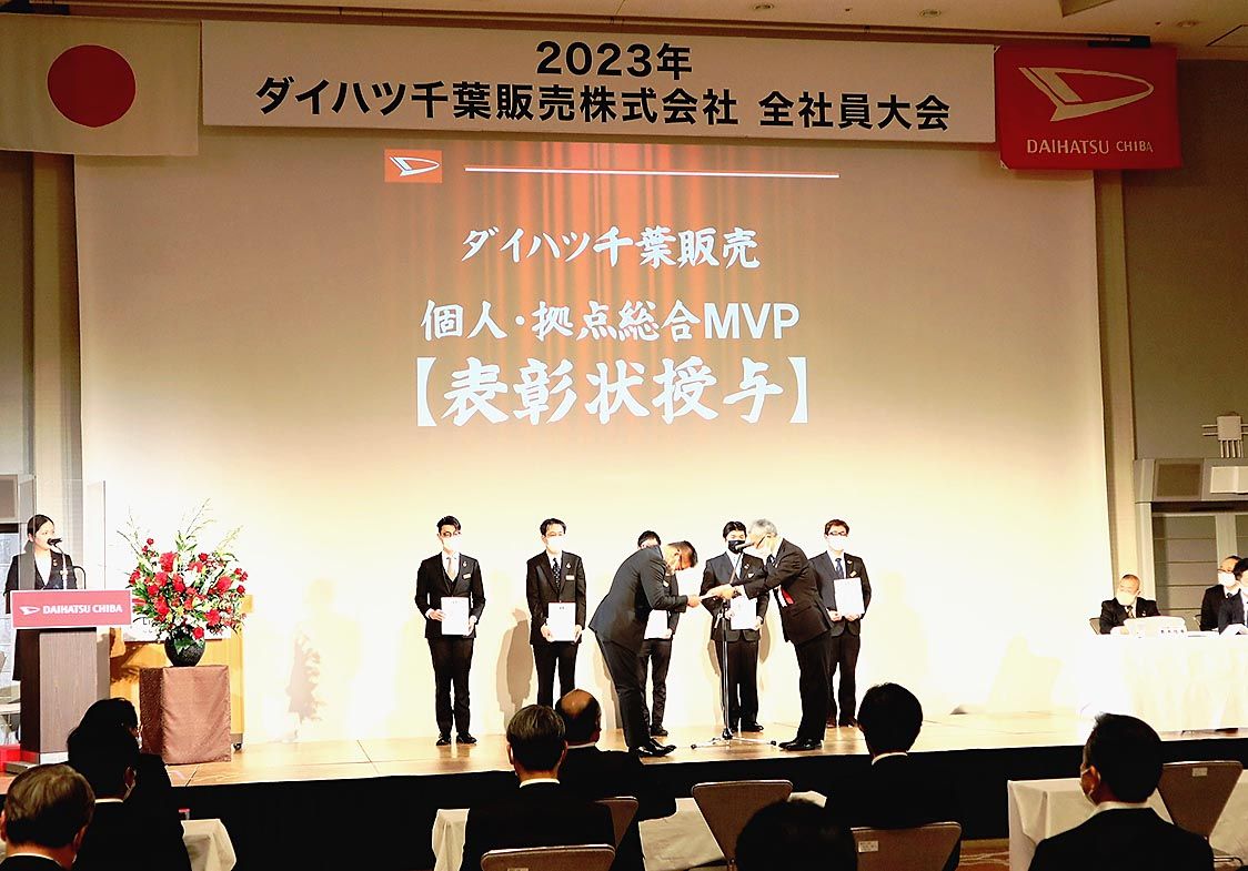 【千葉】ダイハツ千葉(青木信幸社長)は、千葉市内のホテルで「2023年全社員大会」を開いた=写真。22年の県内新車軽自動車販売で27年連続のシェアトップを獲得したことが報告されたほか、22年の活動で優れた成績を上げた社員らを表彰した。 大...