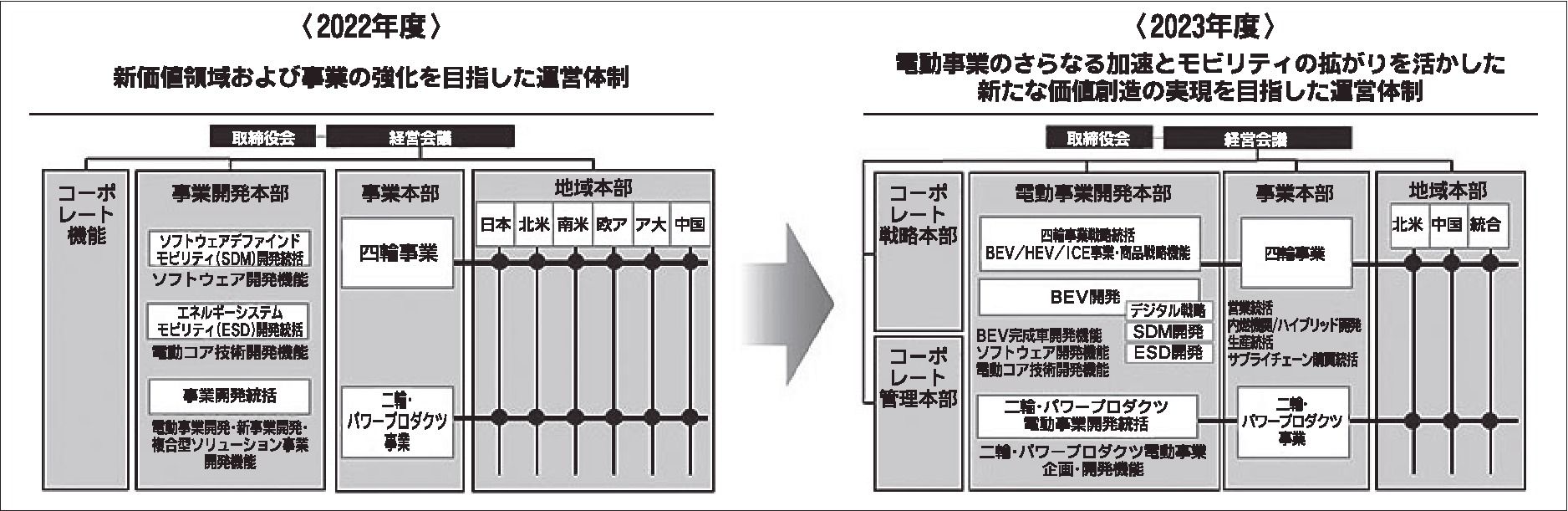 ホンダが4月1日付で組織改正を実施する。目玉は、電気自動車(EV)の基幹技術の開発や適合開発の機能を集約した「BEV開発センター」の新設と、日本本部をアジアや南米などともに「統合地域本部」に集約したことだ。ホンダは昨春にも大幅な組織改正を...