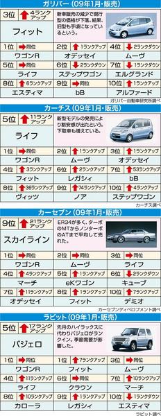 ガリバー自動車研究所、カーチス、カーセブンディベロプメント、ラビットが調べた2009年1月の中古車販売ランキングでは、市況の冷え込みを反映し低燃費で維持費も安い小型車志向があらためて浮き彫りになった。カーセブンでは上位10車種のうち8車種...