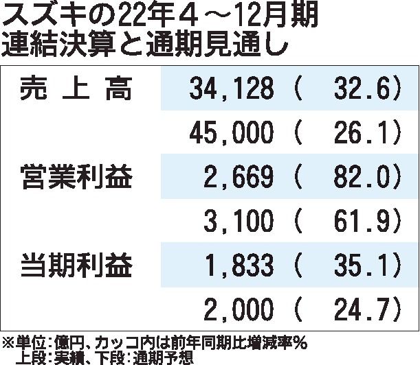 スズキ、2022年4~12月期決算は売上・利益ともに過去最高 通期見通しは利益を上方修正