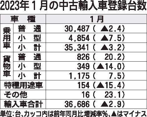 2023年1月の中古輸入車登録、前年比2.9%減の3万6686台 5カ月連続で前年実績を下回る