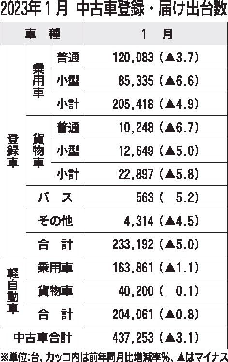 日本自動車販売協会連合会(自販連、金子直幹会長)と全国軽自動車協会連合会(全軽自協、赤間俊一会長)が発表した1月の中古車登録・届け出台数は、前年同月比3.1%減の43万7253台で20カ月連続のマイナスとなった。減少幅は前月に比べて3.1ポイント縮小し、3カ月連続で改善した。