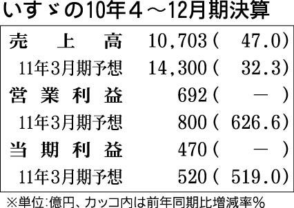 いすゞ自動車は8日、2010年4~12月期連結業績を発表した。売上高は前年同期比47・0%増の1兆703億円。営業損益が749億円増加し692億円、純損益も636億円増の470億円となり2年ぶりに黒字転換した。エコカー減税や補助金の効果で...