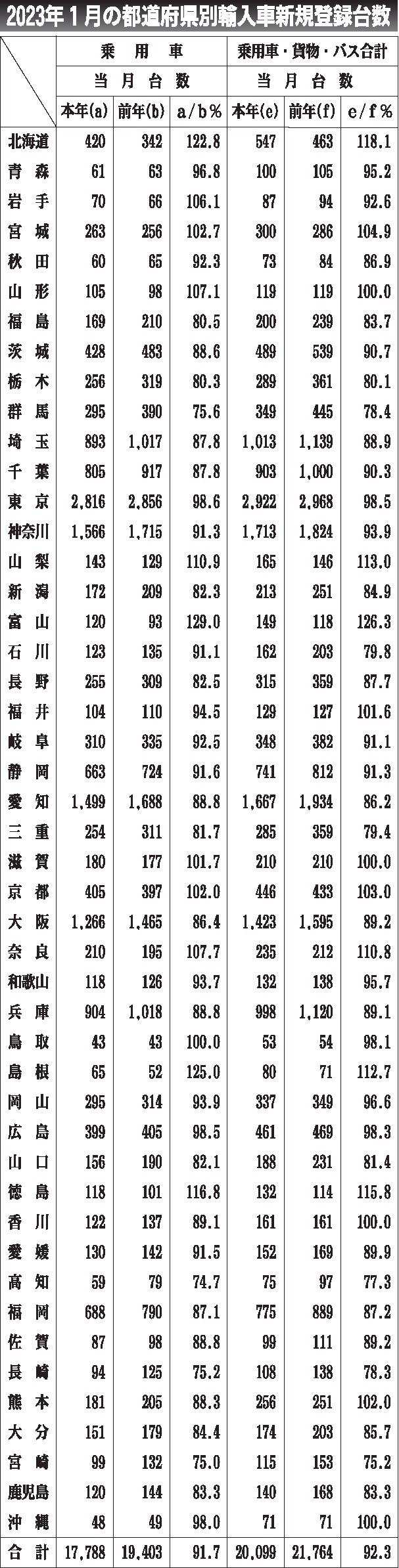 〈2023年1月の都道府県別輸入車新規登録台数〉