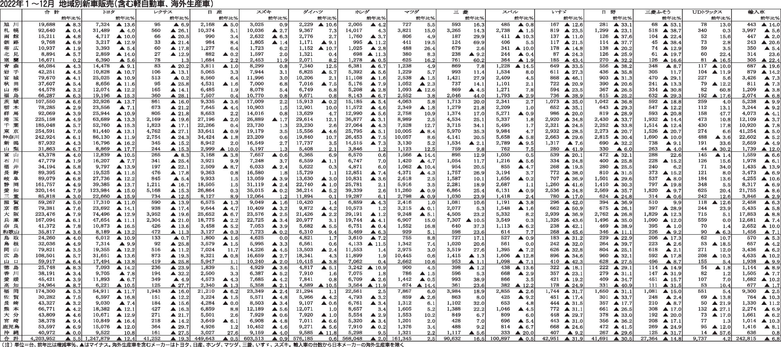 〈2022年1~12月 地域別新車販売(含む軽自動車、海外生産車)〉