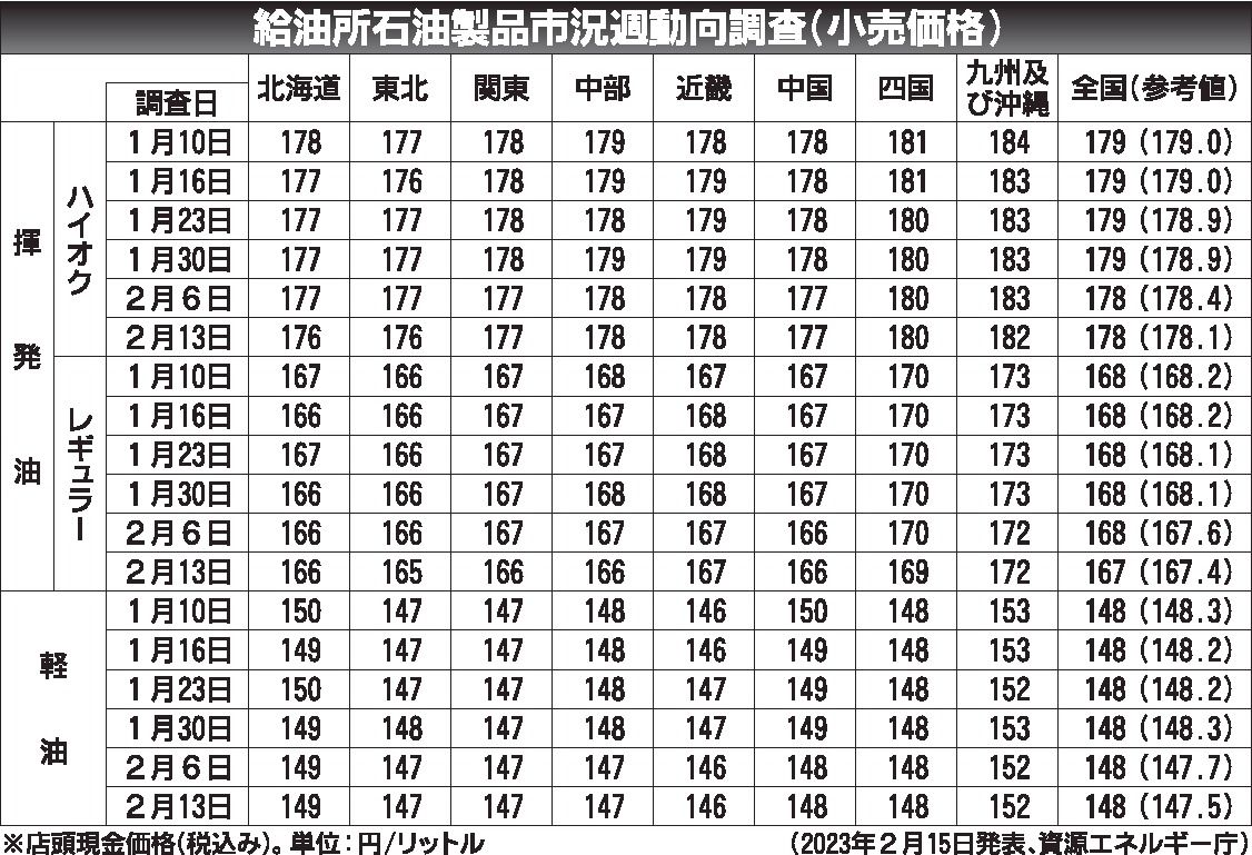 〈給油所石油製品市況週動向調査(小売価格)〉2023/1/10~2/13