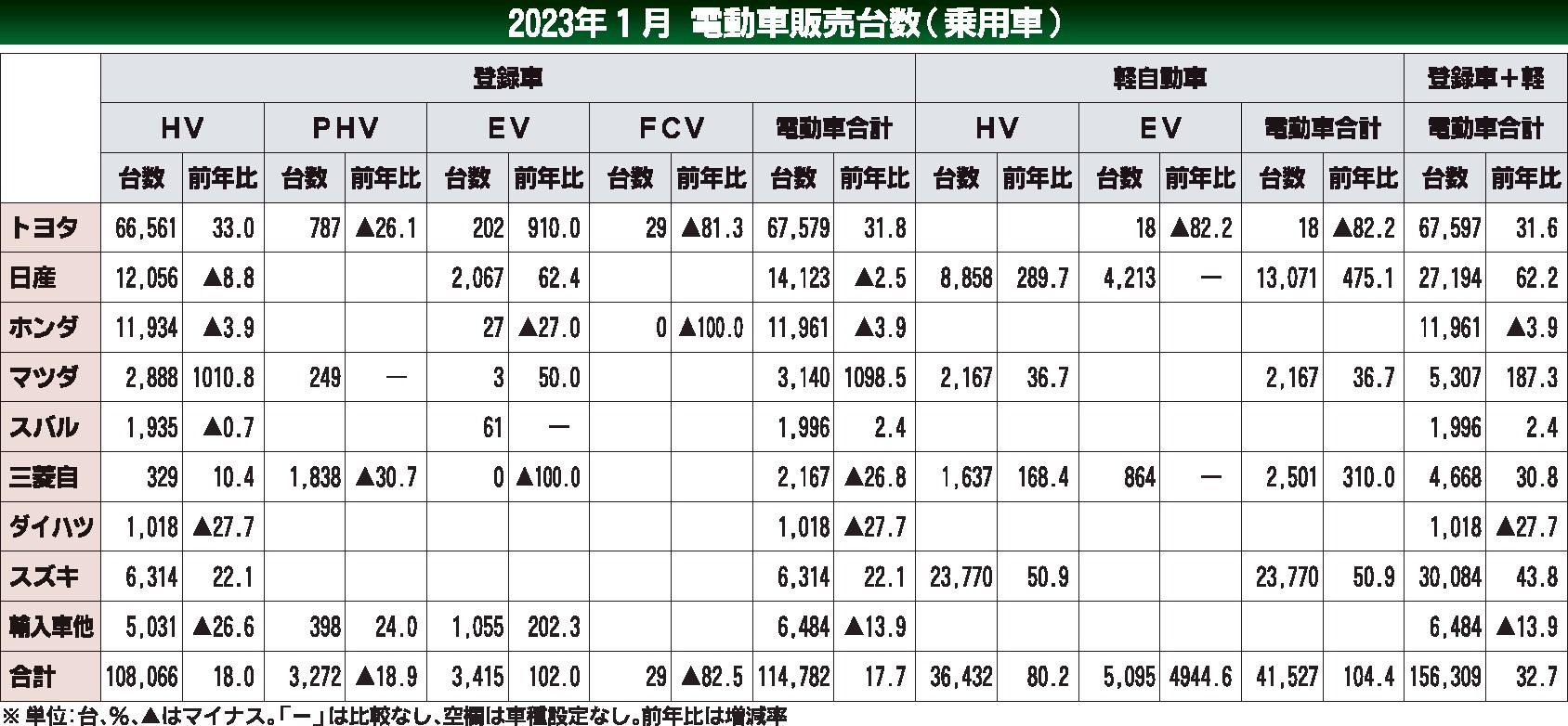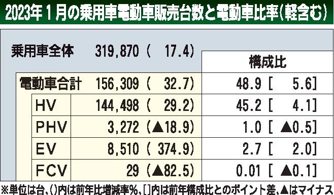2023年1月の国内電動車販売、乗用車の電動車比率が5割に迫る HVは3割増加