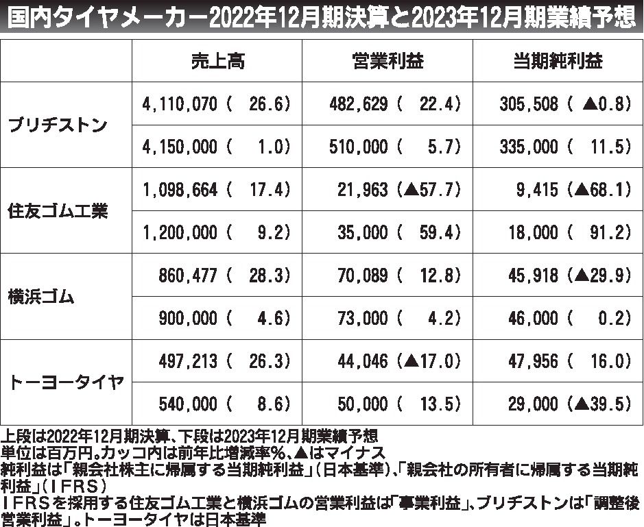 国内タイヤ4社の2022年12月期連結業績が出そろった。売上高は全社とも増収を確保したが、利益面ではブリヂストンと横浜ゴムが値上げと高付加価値路線が奏功して増益となる一方、住友ゴム工業とトーヨータイヤが減益を強いられるなど明暗が分かれた。...