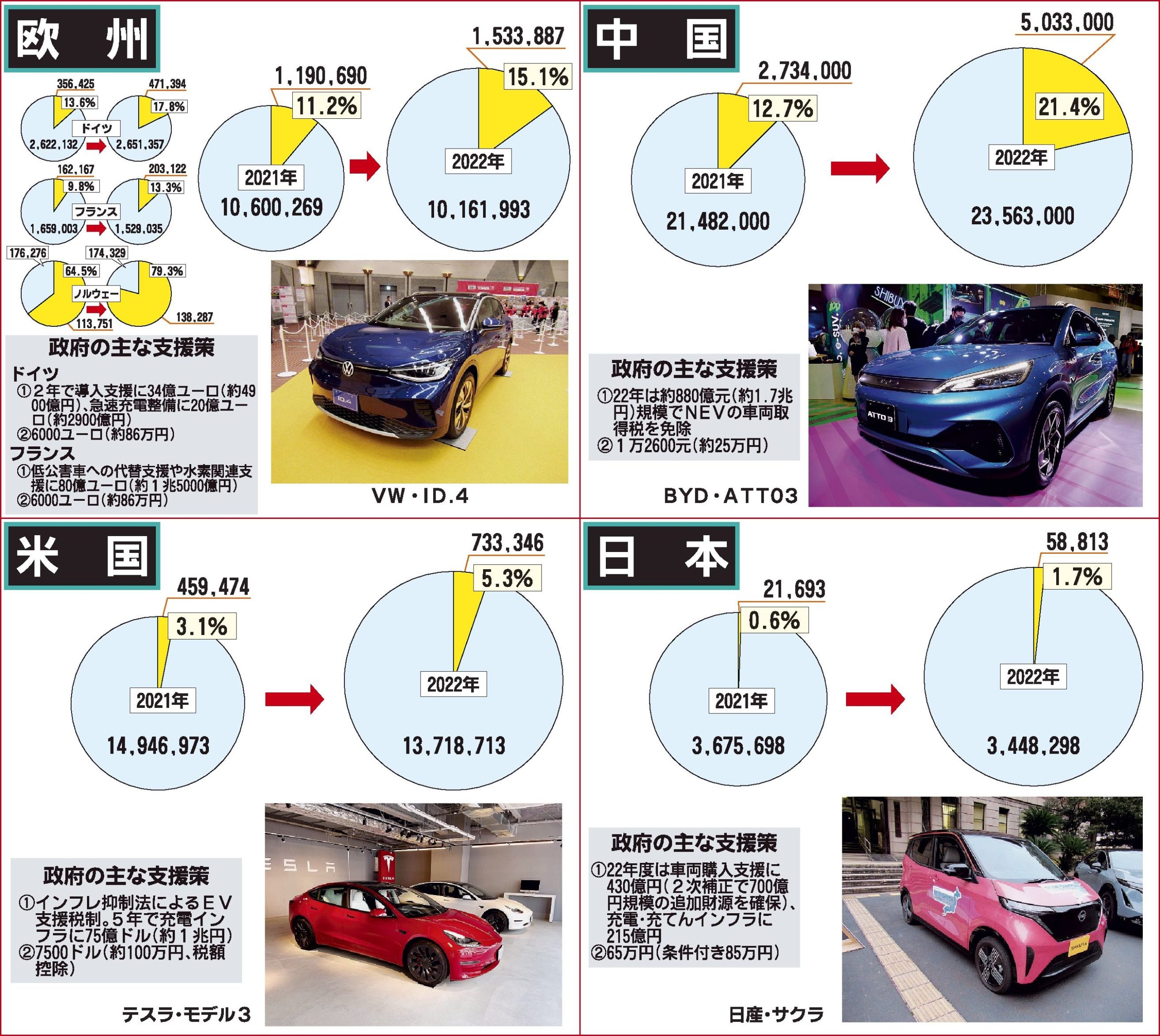 世界の主要市場で乗用電気自動車(EV)の新車販売比率が高まっている。2022年は、中国をはじめ欧州や米国、日本も好調に推移した。カーボンニュートラル(温室効果ガス排出実質ゼロ)実現に向け、自動車メーカー各社が相次いで新型EVを投入したほか...