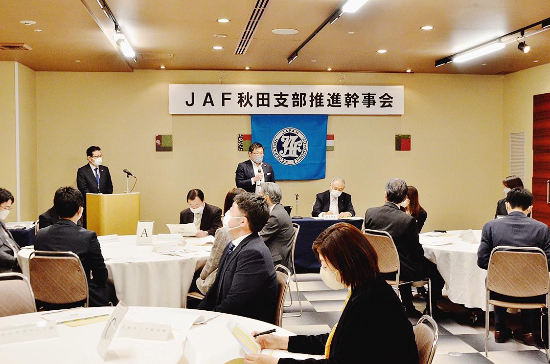 【秋田】日本自動車連盟(JAF)秋田支部(伊藤哲充支部長)は、秋田市で「第110回推進幹事会」を開催した=写真。2022年の会員獲得実績などを共有するとともに、懇親会を開催して交流を図った。また、22年から開始したロードサービス(RS)隊...