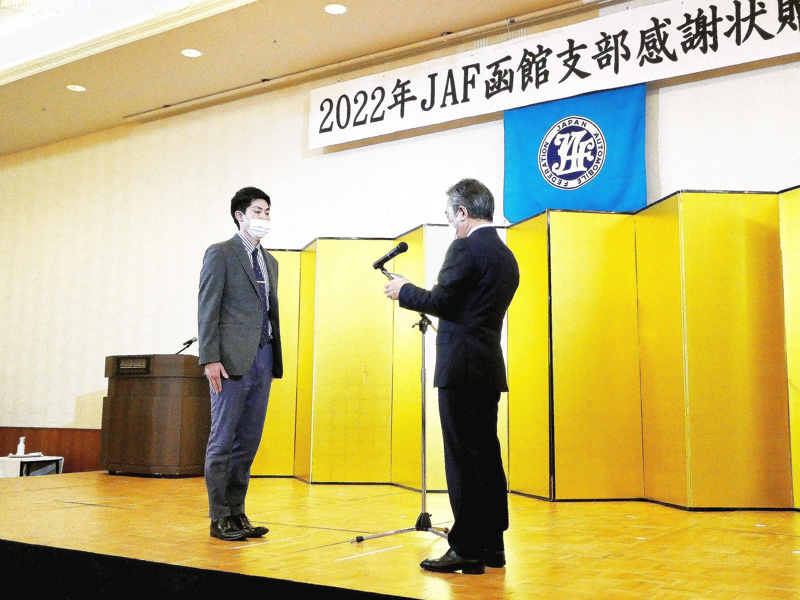 【函館】日本自動車連盟(JAF)函館支部(河村祥史支部長)は、会員拡大に貢献した自動車販売店とスタッフを表彰する「感謝の会」を3年ぶりに開催した=写真。新車ディーラーのトップや営業スタッフら約80人が出席。最優秀個人賞は、ネッツトヨタ函館...