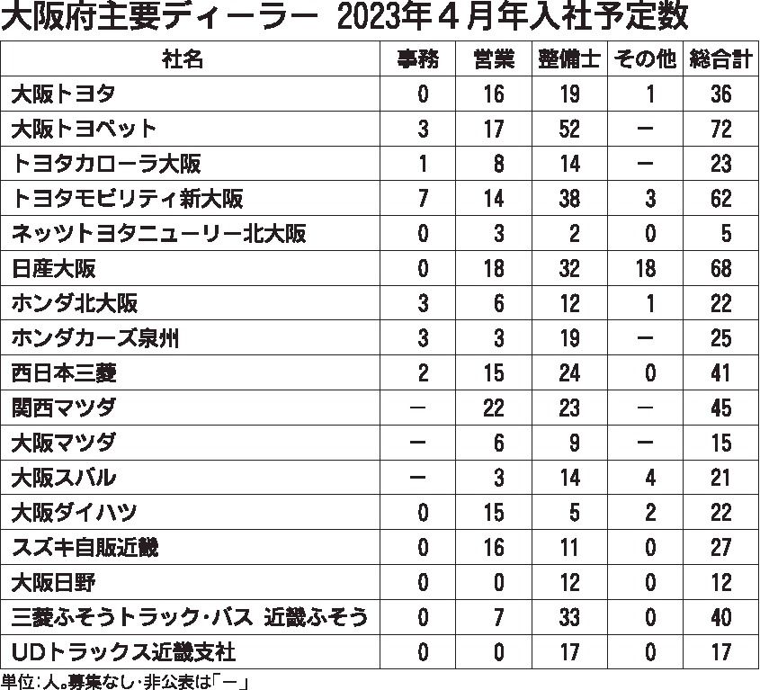 日刊自動車新聞社は、大阪府内の新車ディーラーを対象に採用活動に関するアンケート調査を実施した。2023年4月の入社人数や24年の採用計画などについてまとめた。大阪の自動車流通業界の新卒採用の現状を2回に分けてレポートする。 府内の主要なデ...