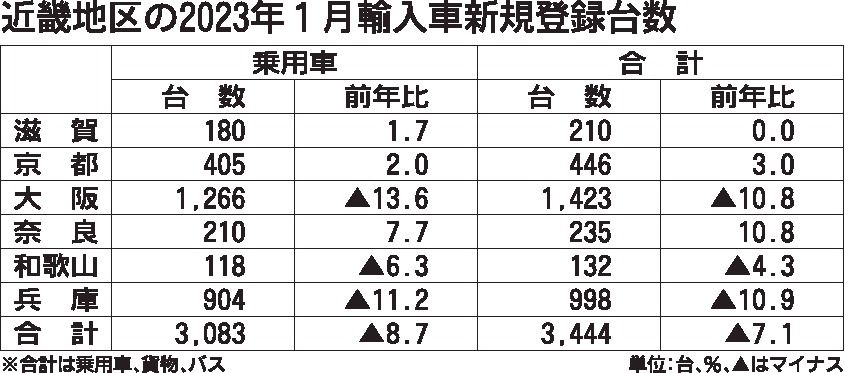 日本自動車輸入組合(JAIA)の発表によると、2023年1月の近畿地区の輸入車新規登録台数(外国メーカー車と日本メーカー車)は、前年同月比7・1%減の3444台となり、4カ月ぶりに前年台数を下回った。外国メーカー車の台数は堅調だったが、国...