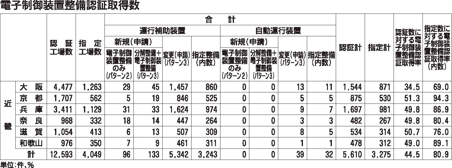 近畿2府4県の2023年1月累計の先進運転支援システム(ADAS)搭載車のエーミング(機能調整)作業に必要な「電子制御装置整備認証」の取得者数は、前年同月比29・5%増の5610件だった。法律施行の猶予期限である24年3月まで1年強となり...