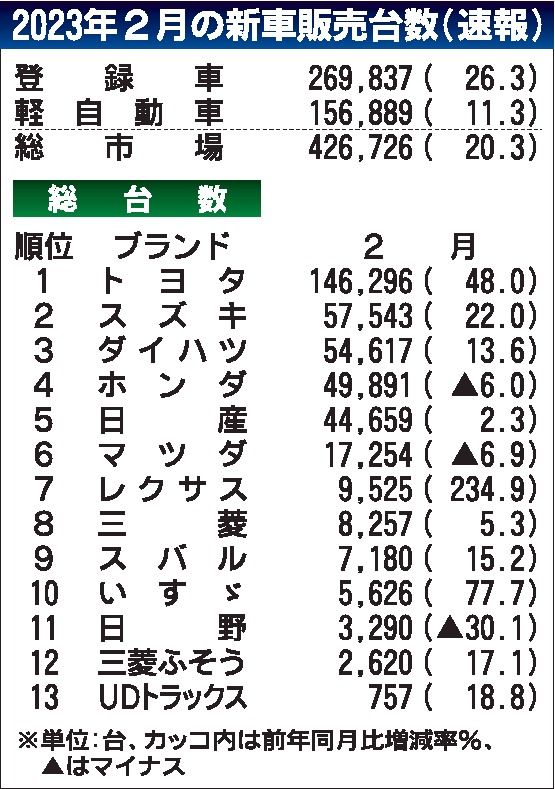 2023年2月の新車販売台数は、登録車と軽自動車の合計で前年同月比20・3%増の42万6726台だった。2月としては2年ぶりに40万台の水準に回復した。前年超えは6カ月連続。増加幅は前月から4・3㌽上昇した。一部銘柄で、新車の供給制限が緩...