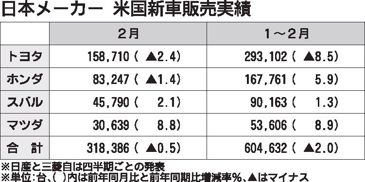 日本の自動車メーカー4社が1日に発表した2月の米国新車販売台数は、31万8386台(前年同月比0・5%減)となり、2カ月連続で減少した。トヨタ自動車とホンダがマイナスだった。各社とも依然として半導体不足などの影響を受けている。 メーカー別...